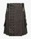 Heavy black denim kilt is a modern and traditional Scottish kilt. In this kilt, the front side is decorated with a charming design. The front side is a plain apron with two nylon straps with studs on each strap. The back and side are in pleated design, which is easy to move in the working place. There are two pockets on the side of the kilt. Each pocket has enough space to hold the different materials. Each pocket is designed with a leather strap and buckles with eyelets. One strap and a D-ring are also patched with a flap pocket. Two nickel clips are fixed with a belt loop, which is used to join the chain quickly. The belt loop is used to hold the belt quickly and comfortably.