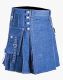 Blue Denim Kilt with Silver Chain is a versatile kilt with an exceptional design. It perfectly blends style and functionality for men seeking a kilt with classic features. It comes with a new fashionable look that attracts viewers. It has utility features of cargo pockets with snap buttons on the flap for storing your essentials. These pockets are decorated with denim straps, eyelets, and studs for an elegant look. Four small button straps make a unique design for kilt closure.