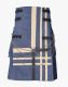 Fashion Utility Kilt apron is plain and smooth. This is well-proportioned among stripes and chains. The white-striped pattern looks gorgeous, running across the apron. Also, black nylon strips increase the beauty of this blue kilt. The chains hanging through hooks are classy and give a graceful look to the front. Three straps with O rings and black studs at the front help adjust the Blue Kilt. Flapped cargo pockets with shiny studs and buttons enhance its beauty. This kilt is lightweight and easy to use. Fashion Utility Kilts are made of 100% cotton. The color of this kilt is blue, which is attractive. You can also order any color you like. Material for Studs, buttons, and rings is rust-free. Providing quality kilts is our company’s priority. So, order now.