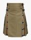 Khaki and Camel Thomson Tartan Hybrid Kilt combines Camel Thomson Tartan and khaki drill jeans fabric. It is a must-have for anyone who wants to stay in both fashionable and traditional looks. 100 % cotton and pure Acrylic wool material is used to manufacture it. Like a traditional kilt, its front apron is simple, while a pleated design on its rear. Its pleats are made of Camel Thomson Tartan, while the front is cotton. It has two large cargo pockets on both sides to carry your essentials. Camel Thomson Hybrid Kilt has belt loops by which D-rings are attached to each of the loops. It also has leather straps with buttons for fastening and kilt adjustment. Khaki Hybrid Kilt is an excellent choice for weddings, formal events, and highland games. Due to its modern design with historical style, it will give you a unique appearance. It would be a better option for tough activities like gaming events and other hard-working jobs as it comforts you during your movement. A top-quality kilt is available in all sizes.