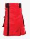 Men's Two-Tone Red Utility Kilt with Large Pockets is perfect for trending events because its attractive design and striking style add a unique flair to your kilt collection and garment. The kilt has a flat front apron, while black nylon straps are sewn on the right of the front apron to make it a stylish piece of Scottish attire. The black belt loops for holding and wearing a belt make the waist and kilt a perfect fit. Red Utility Kilt has features of two cargo-style pockets that allow you to store your personal belongings with easy access. Black flap pockets make an attractive and good contrast for the red kilt. It has snap buttons on the waistline for a secure and better fit. It features a pleated pattern on the back to add a traditional touch and allows comfortable movement on various occasions. Red straps with decorated eyelets are on either side for kilt adjustment through the side buckle. Our maker makes this kilt with 100% drill jeans cotton material, which is durable and washable. Rust-free hardware material is used in this kilt. You have a completely customized option on size and color combinations, in which you select your favorite ones that match your personality. So place your order now and get this two-tone utility kilt at a fair-minded price.