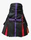 Modern Black Rainbow Hybrid Kilt has a flat apron decorated with nylon straps. It has three adjustable nylon straps connected with O-rings on both sides of the apron. The purple nylon straps are styled on the front apron, adding elegance to the kilt’s appearance. It has a snap closure on the top front, which helps ensure a comfortable and secure fit. Pockets and lobster clasp straps on either side provide functional features. A pleated pattern on the back resembles ancient Scottish culture.