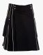 Modern Black Utility Kilt with White Piping is specially designed for a fashion-forward man seeking a new and attractive look in their garment. In addition to its modern appearance, it offers functionality and traditional design to your outfit. This kilt comes with a simple style of plain front apron. In contrast, white piping is sewn with black pleats on either side, making the kilt attractive and charming look. The white color makes a great contrast with the black color. Modern Black Utility Kilt has two-tone detachable pockets on both sides to store your belongings safely. You can detach these pockets when you're not feeling comfortable. Snap buttons are styled on the top waist for kilt closure. Loops are sewn on the waist to hold the belt and accurately fit the waist. Modern Black Utility Kilt with White Piping is fabricated with pure drill jeans cotton fabric with elegant quality hardware material, which is rust-free. Great quality kilt to wear on wedding functions, traditional events, or any other specific occasion. We offer it in various colors, so you can choose your best to elevate your personality uniquely. We delivered excellent quality material at a cheaper rate. So please place your order now and facilitate with our handmade kilt.