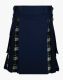 Navy Blue Dress Gordon Tartan Hybrid Kilt combines Navy blue drill jeans fabric and Gordon Dress Tartan. Gordon Dress Hybrid Kilt has a traditional design like other kilts. The front apron is simple, while its rear has a pleated design. Pleats all around the kilt are made of Dress Gordon tartan. Leather straps are used to adjust the kilt. It comes with two large cargo pockets on which customizable buttons are available. D-rings and leather straps add some extra touch to the kilt's beauty.