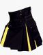 Women's Black and Yellow Hybrid Kilt with Studded Apron is a trendy garment that offers a stylish look and functional elements. It makes your events more memorable and makes you unique due to its distinctive design. It is handmade and comes with a customization option, so you can get a kilt of your choice that will satisfy your needs. Women's Black and Yellow Hybrid Kilt has a studded front that looks modern. It has snap buttons on the front waistline area, allowing wearers to have a perfect and secure fit. Two buckle straps are styled below the waistline area, which offers a comfortable adjustment. It comes with flap pockets on either side of a kilt that provides enough storage for your daily used items like a Cell phone, Wallet, and Keys. It has a pleated pattern around the back, made of yellow fabric. It is traditional and makes your movement easy while performing tough activities. Black and Yellow Kilt with Studded Apron is fashioned with exceptional quality cotton. All the hardware material used is rust-free. Whether you are attending a casual party or a Formal event, this kilt will make your look unique from others. It is also a good choice for Scottish weddings and other Special occasions. Order now to buy this kilt at a cheap price.