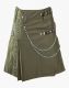 Women's Olive Green Gothic Kilt has an amazing modern design decorated with rust-free hardware. It is the perfect blend of historic design and fashion. On the waistline, it has fastening buttons on the right side. On the left, there are leather straps for a comfortable fit. The front of the Gothic Kilt has a stylish design decorated with chains, D-rings, and leather straps. It features a pleated design on its back. With each belt loop, D-rings are attached. There are two lobster clasps on it by which chains are hooked. A strip running downwards with D-rings on the right of the kilt adds a touch of modernity.