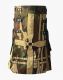 Woodland Camo with Khaki Gothic Hybrid Kilt is a new fashionable kilt that gives you a stylish outlook on different events. It is made with a different color combination, which helps you choose the best one that matches your preferences. The kilt has an attractive front apron decorated with rivet buttons and khaki straps. These straps are connected with O-rings on the center of the apron, which gives it a unique design. Woodland Camo with Khaki Gothic Hybrid Kilt features three nylon straps on the apron, which are connected to an O-ring. A pleated pattern is made on the back, giving you easy movement and adding a touch of traditional design. It has ample cargo pockets on either side, which allows you to store your utility items like Cell phones, wallets and Keys with the help of a flap button. A lobster hook is also attached with loops to attach keys and other lightweight items during your work. Snap buttons are used on the top-front waist for kilt fastening. This kilt is crafted with pure cotton fabric and quality hardware, which ensures its durability and longevity. You can get a kilt in your desired size at a fair price. You can wear it at Scottish Weddings, Casual parties, and Formal occasions. Order it now.